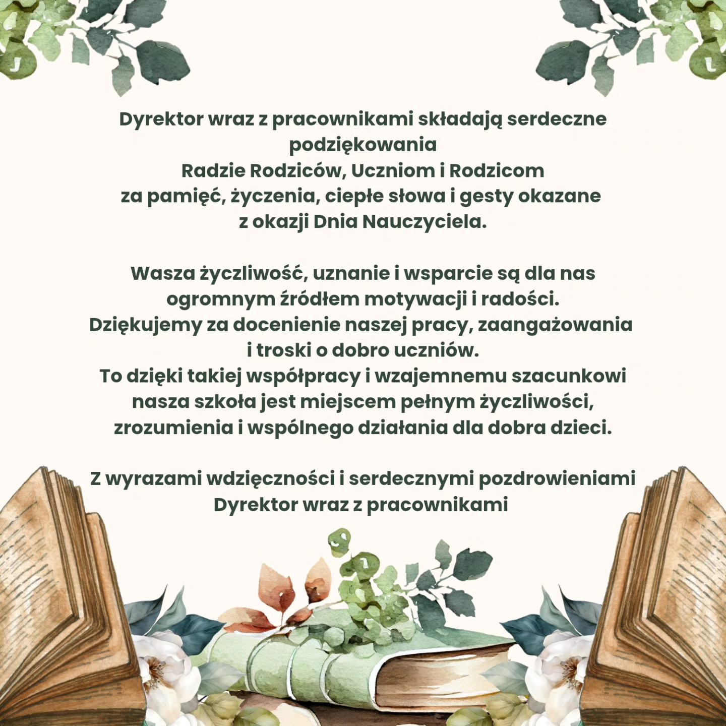 Z okazji Dnia Edukacji Narodowej dzieci ze świetlicy szkolnej przez cały tydzień brały udział w zajęciach poświęconych trudnej i odpowiedzialnej pracy nauczyciela, podczas których uczyły się okazywać szacunek wszystkim osobom pracującym w szkole. Podczas zajęć powstały piękne laurki z życzeniami, a także portrety nauczycieli