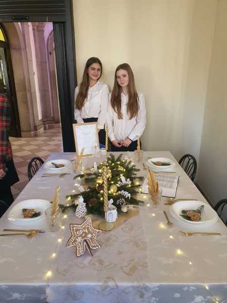 10 grudnia br. w Zespole Szkół Nr 2 w Dzierżoniowie odbył się konkurs na najpiękniejsze aranżacje stołów wigilijnych. Naszą szkołę reprezentowały uczennice z klas 8a i 8b. Alicja Siwik i Laura Pala przygotowały prześliczną aranżację stołu pod nazwą Przy opłatku i świecach, a Nikola Kaźmierczak i Zuzanna Chmielowiec zaprezentowały uroczy Zimowy stół wigilijny. Obie drużyny zdobyły wyróżnienie! Serdecznie gratulujemy!
