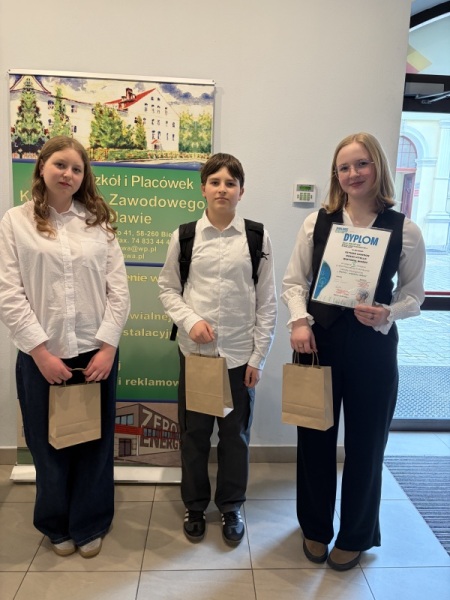 Troje naszych uczniów: Noemi Vittelo, Wiktoria Woźny i Szymon Gawron uczestniczyło w Powiatowym Konkursie Ekologicznym organizowanym przez Zespół Szkół i Placówek Kształcenia Zawodowego pod hasłem „Ziemia – wspólne dobro”. Uczestnicy wzięli udział w quizie wiedzy na temat historii szkoły organizatora oraz prezentowali wykonany przez siebie plakat i prezentację wybranego źródła energii. Plakat i prezentacja naszych uczniów były kreatywne, pomysłowe i oryginalne. W quizie zdobyliśmy 3 na 6 punktów, a naszą prezentację i plakat jury oceniło na 7 z 10 punktów. Zajęliśmy 5. miejsce, prezentując bardzo wysoki poziom. Gratulacje dla trójki wspaniałych uczniów z naszej szkoły!